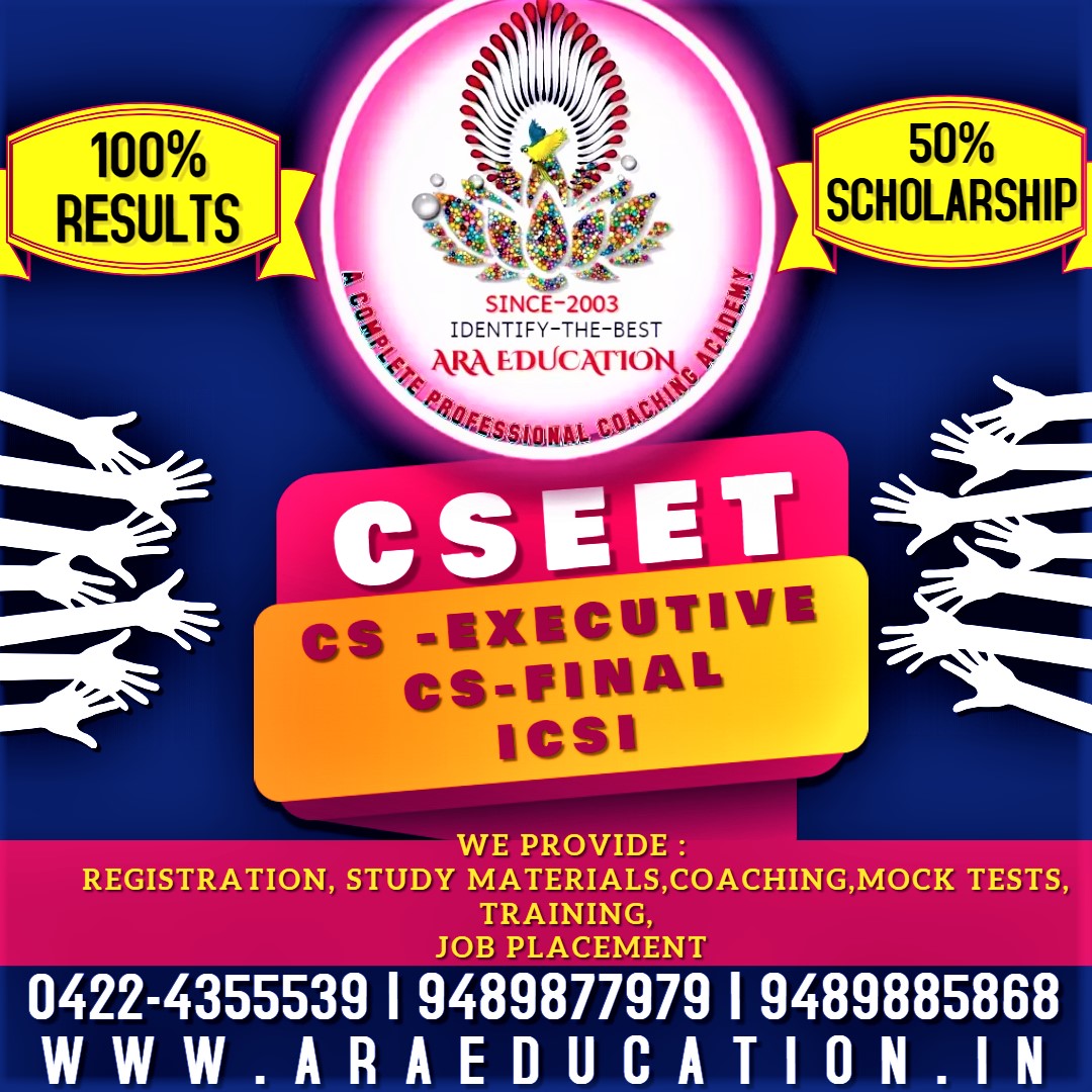 ARA EDUCATION is the best cs coaching class provider in Coimbatore Tamilnadu India. Since 2003 ARA EDUCATION is an exclusive academy for cs course of ICSI.ARA EDUCATION is launched exclusively for all three levels of CS. ARA EDUCATION is proud to have a perfect combination of successful, well-known faculty members and experienced, equally dynamic CS Professionals. ARA EDUCATION has been founded to the best possible training to realize your ambition to be a successful Company Secretary at an early age. ARA EDUCATION has gained a large volume of students since 2003 as a top pioneer Institute specialised in CS coaching in Coimbatore, Tamilnadu, India.